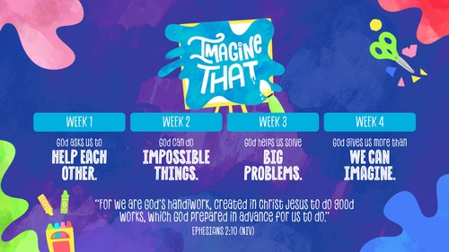 In this 4-week series, kids will hear about some of the amazing things God did through Elisha to help people imagine how their gifts could make a difference. They'll see how God asks us to help each other, God can do incredible things, and how God helps us solve big problems. By the end, we'll start to see the wonderful things we can do when we know God gives us more than we can imagine.
